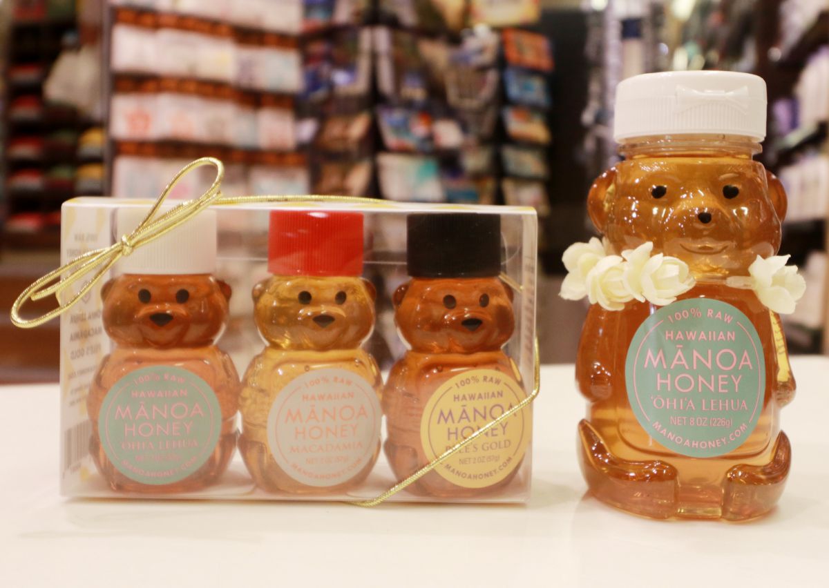 可愛らしいくまのボトルで人気の「マノアハニー」は、オアフ島内で取れるさまざまなハチミツから製造されています。左はお土産に最適な「ハニーギフトセット 3個入り」$11.99、右は「オヒアレフア・ハニー」$9.99です。