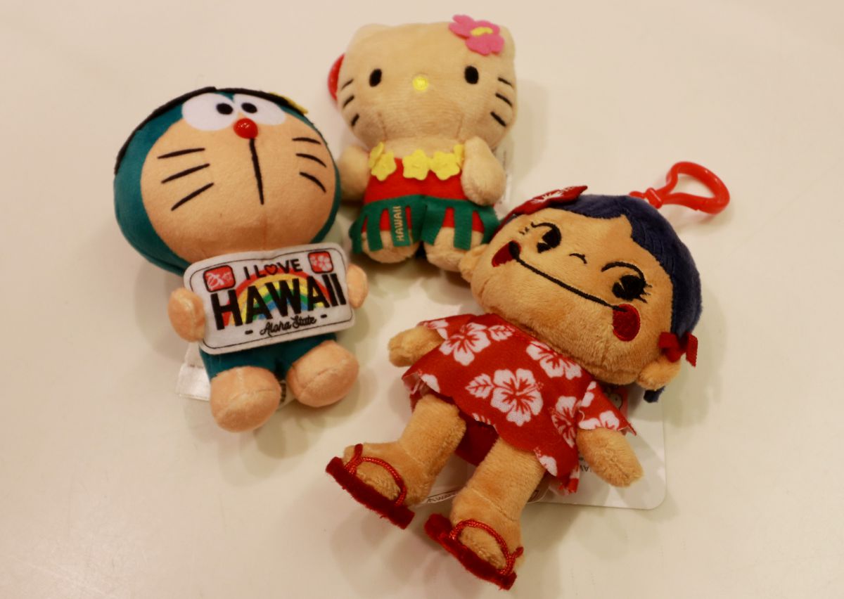 定番のお菓子以外にも、店内にはかわいらしい雑貨や小物もたくさんあります!中でも一番に目をひいたのが、こちらの日焼けマスコット!ドラえもん、キティーちゃんにぺこちゃんまで、み~んな日焼けをしています。「クリップ付きぬいぐるみ」は、各$13.99。