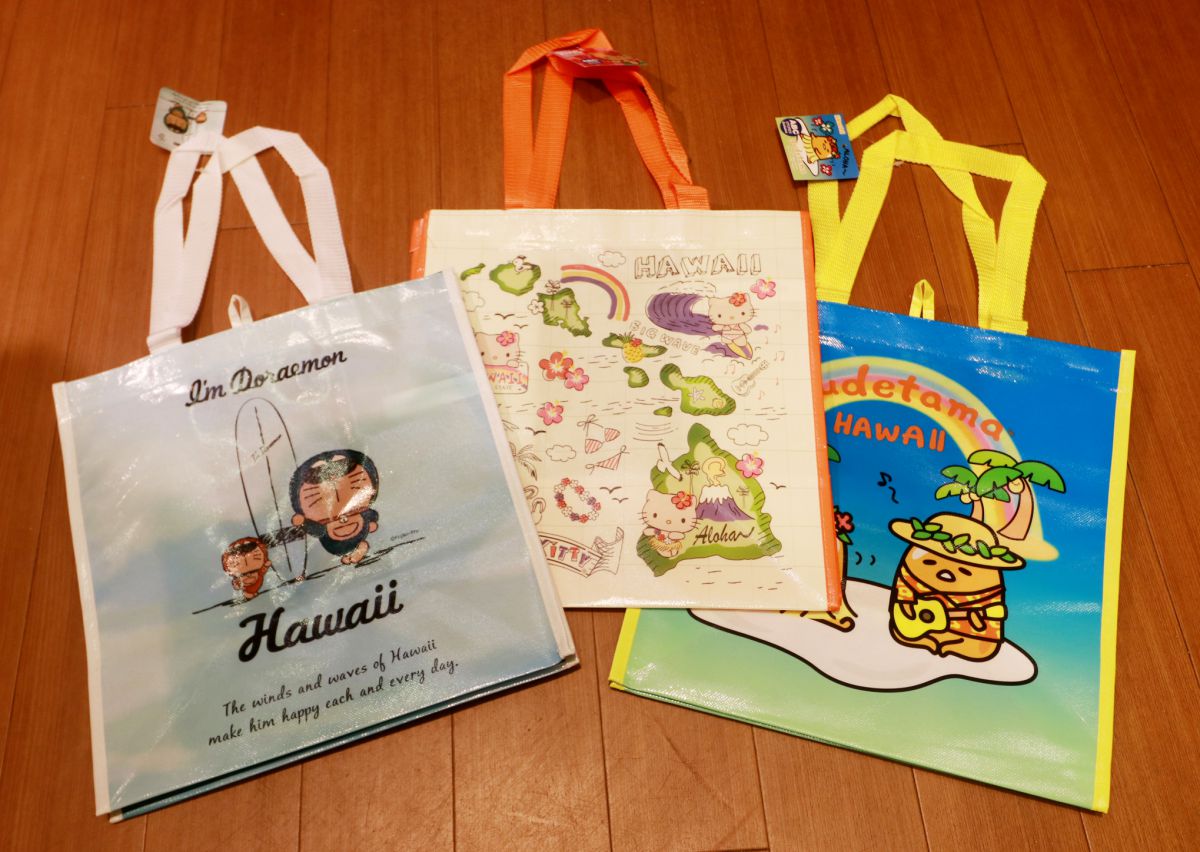 ハワイ限定のエコバックはおみやげにも最適!左から「日焼けドラえもんエコバック」$5.99、「キティーちゃんエコバック」$3.99、「ぐでたまエコバック」$5.99。お気に入りのキャラクターがいたら、マストバイです!