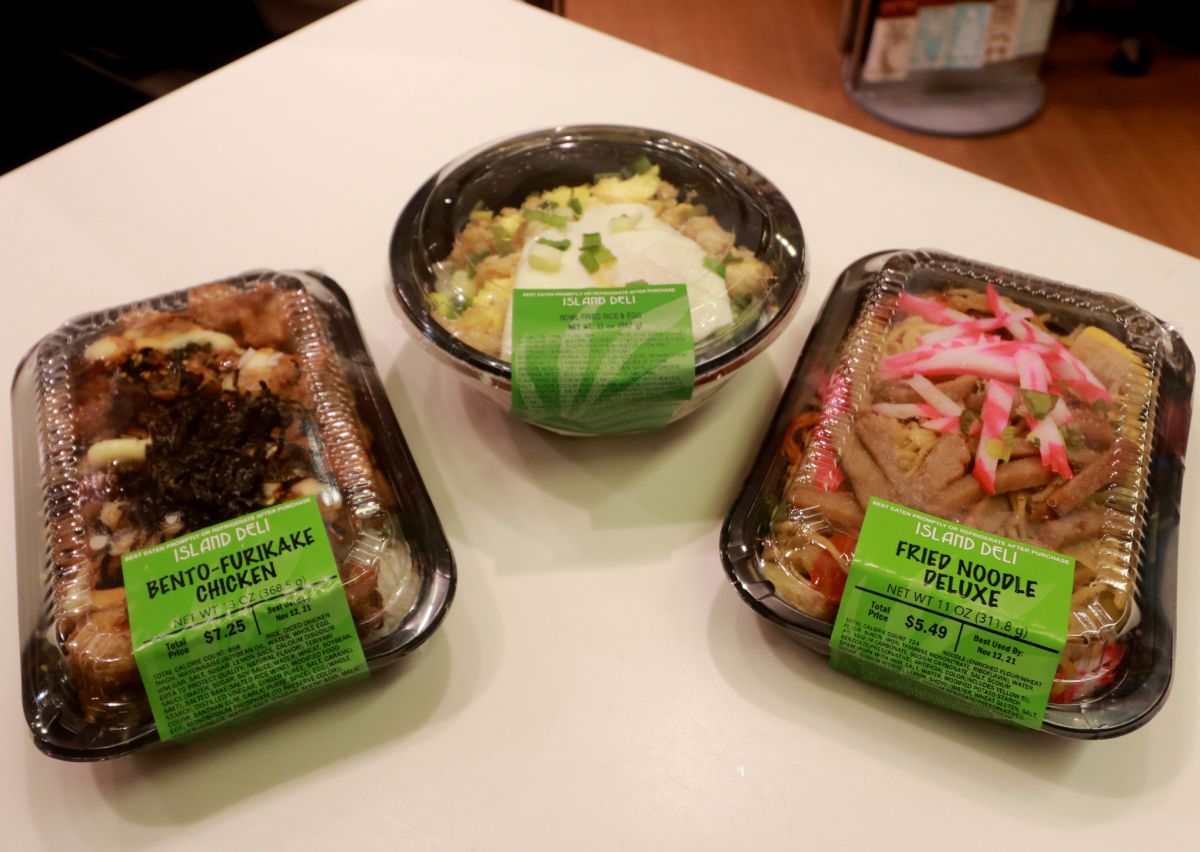 丼ぶりや焼きそばを発見!左から「フリカケチキン弁当」$7.25、「フライドライス・エッグボウル」$4.99、「デラックス・フライドヌードル」$5.49。
