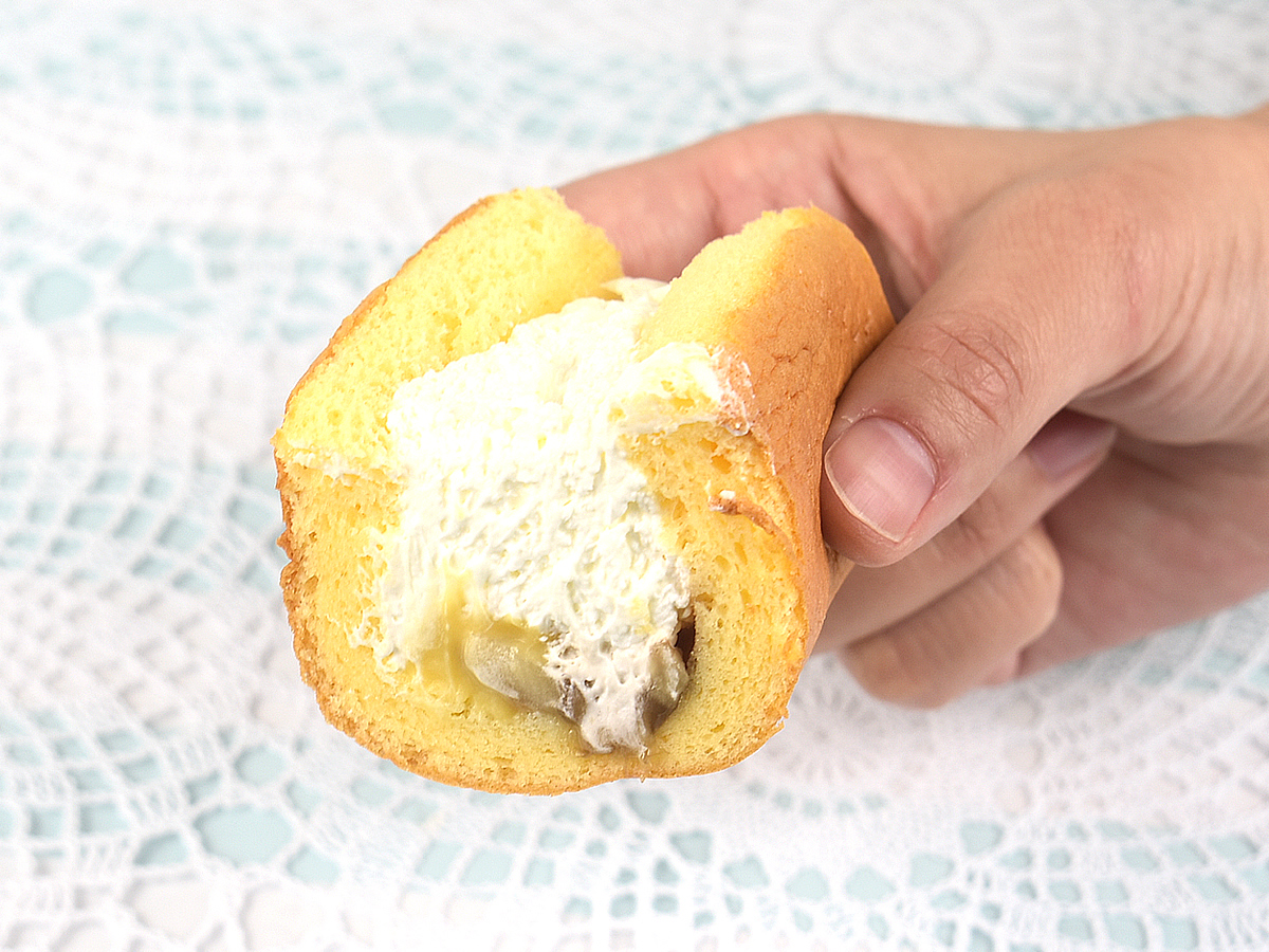 台湾カステラはふっくらと分厚い生地が特徴ですが、この商品は生地を折りたたむようにクリームをサンド。たっぷりのホイップクリームの下には、カスタードソースとバナナスライスも潜んでいます。