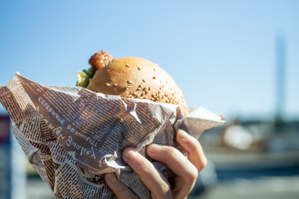 バーガーを袋に入れ、バンズを優しくプレスして、薄くします。カリカリに揚げられた金目鯛のフライが、バーガーから飛び出してしまいました。