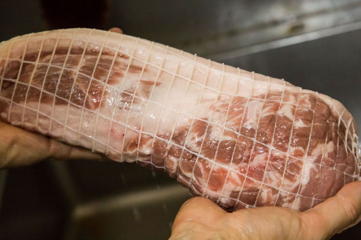 チャーシューに使うのも、スープと同じ北海道産四元豚の肩ロース。ちなみに、普段われわれが口にする豚肉は基本的に、3つの品種をかけあわせた三元豚です。四元豚はさらにもう一品種を加え交配させており、より肉質がイイのだとか。