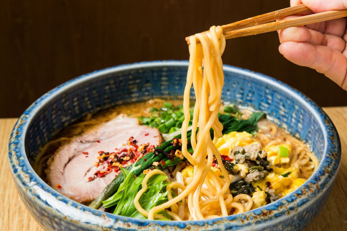 特製の太ストレート麺はモチモチの食感で、250gとボリューム満点。味噌は大豆から厳選し、米麹、塩と水だけを使って仕込み熟成させたものを使っており、コク深くやさしい味わい。