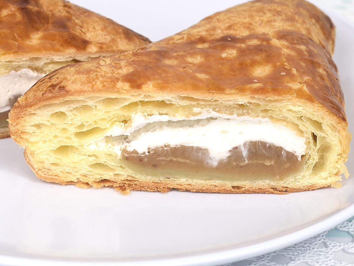 パイの中身は渋皮マロンペーストだけではありません。栗だけでは少し足りない甘みは、ホイップクリームが補完。ミルキーな味わいのクリームと芳醇な渋皮マロンペーストの相性は抜群です。パイ生地のパリパリとした食感となめらかな渋皮マロンペーストのギャップは、「三角モンブラン風パイ」特有のポイント。さらにフォークが必要なモンブランとは違って、片手でカジュアルに楽しめるのも嬉しいですよね。お供のドリンクには甘さが欲しいならミルク、ビターな味を楽しみたいという人はコーヒーと一緒に食べるのがオススメです。