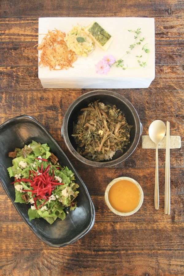 上の料理は、「ボジャギビビンパッ」。コース料理を注文すると、プラス2000ウオンでメイン料理をこちらに変更もでき、実はこのビビンパッがお店で一番人気なんだとか。卵が入っているのでヴィーガン料理だけ!という方にはオススメできないのですが、そうでない方にはぜひトライしてほしい、とスタッフの方イチオシのメニューです。日本の風呂敷のような意味で使うボジャギのように、卵でビビンパッを包んであるのもかわいいですよね。