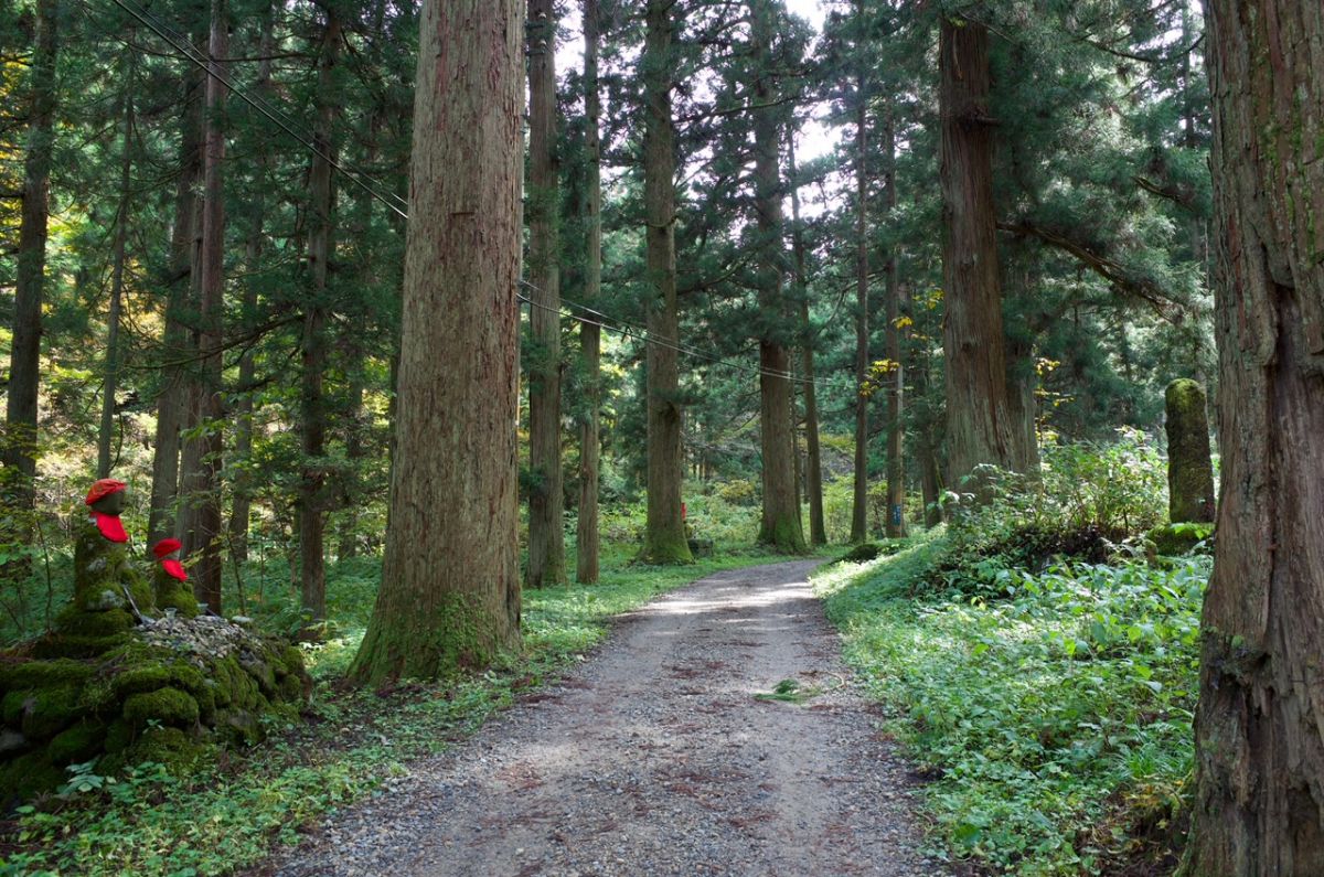 お寺までの約500mの杉並木は、木漏れ日が射し込む清々しい空間です。道の途中にはお地蔵様などが立っているので、心を清めるように散策しながら進みましょう。