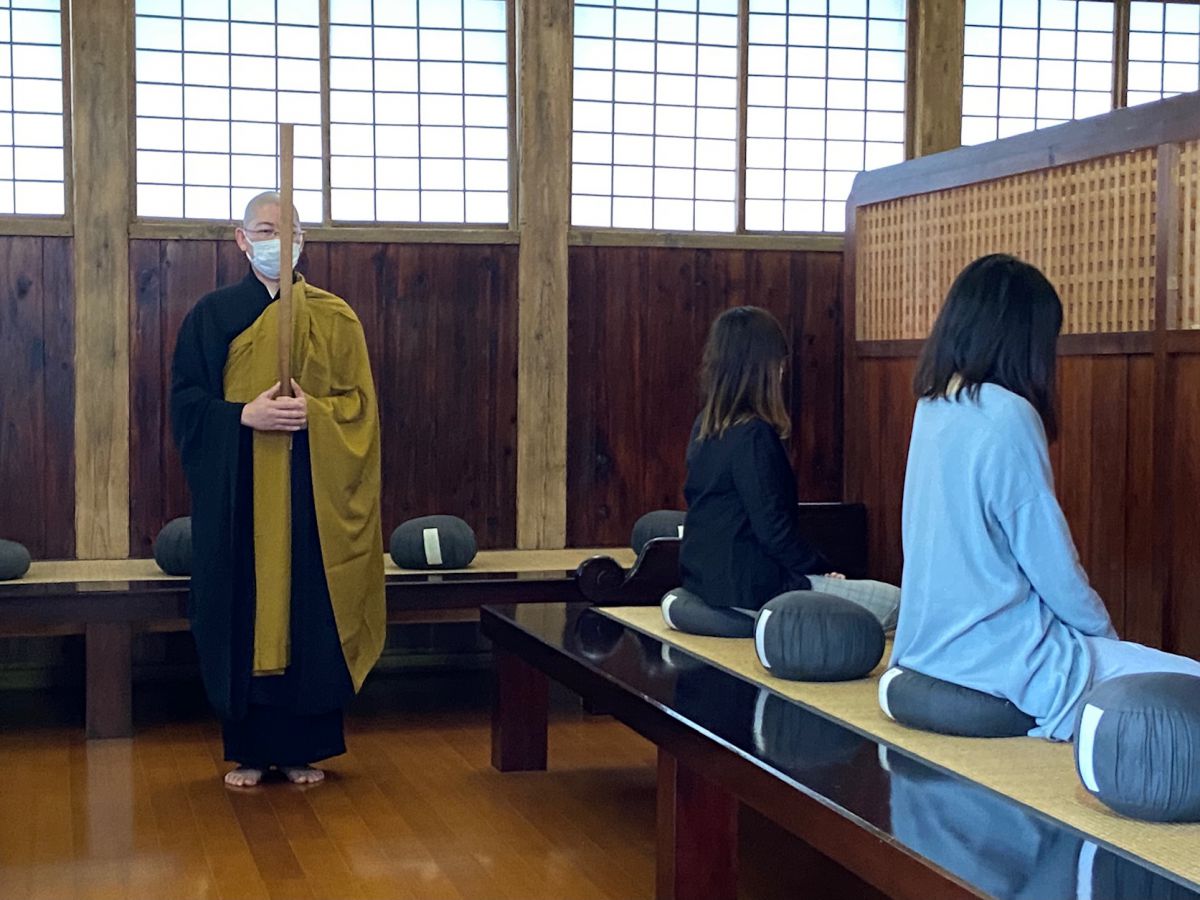 お堂について受付後、坐禅堂へ。指導いただくお坊さんの説明を聞きながら、坐禅体験がスタート。坐禅の大切なポイントは3つの「整う」。身体、呼吸、そして心を整えます。壁に向かって姿勢を整えた後、静かにゆっくり呼吸をして、頭に浮かぶいろいろな考えをそのままそっと流していきます。これがなかなか難しい…。どうしても身体が動いてしまうときは、お坊さんに警策(きょうさく)と呼ばれる板で右肩を打っていただきましょう。通常の坐禅体験は約40分。普段の生活ではなかなか味わえない、すっきりとした気持ちに包まれます。