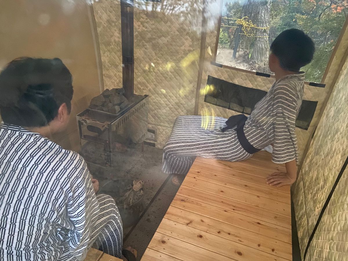 こちらに新しく生まれたのがテントサウナ。文字通りテントの中にストーブがおいてあり、浴衣を着て入ります。