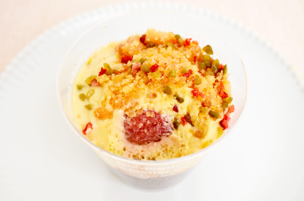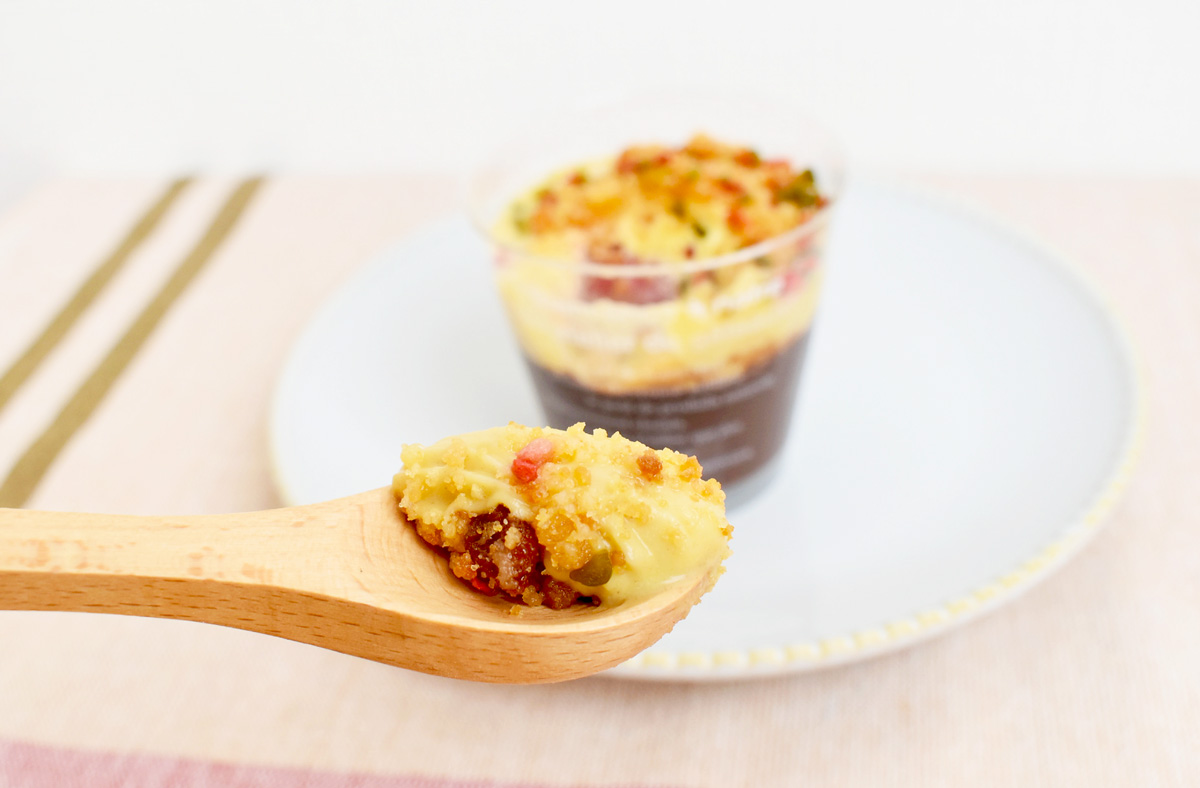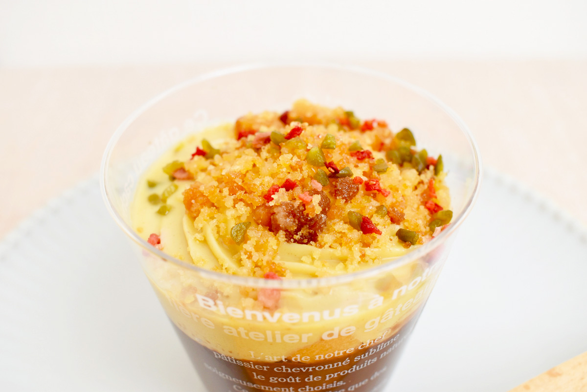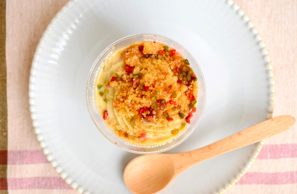 蓋を外して上から見ると、まず目を奪われるのはその華やかさ! 淡い黄緑色のピスタチオクリームの上には、ピスタチオ、フリーズドライストロベリー、シュトロイゼル(小麦粉、砂糖、卵などを混ぜ、ポロポロの粒状にしたもの)が散りばめられていて、とってもきれいです。