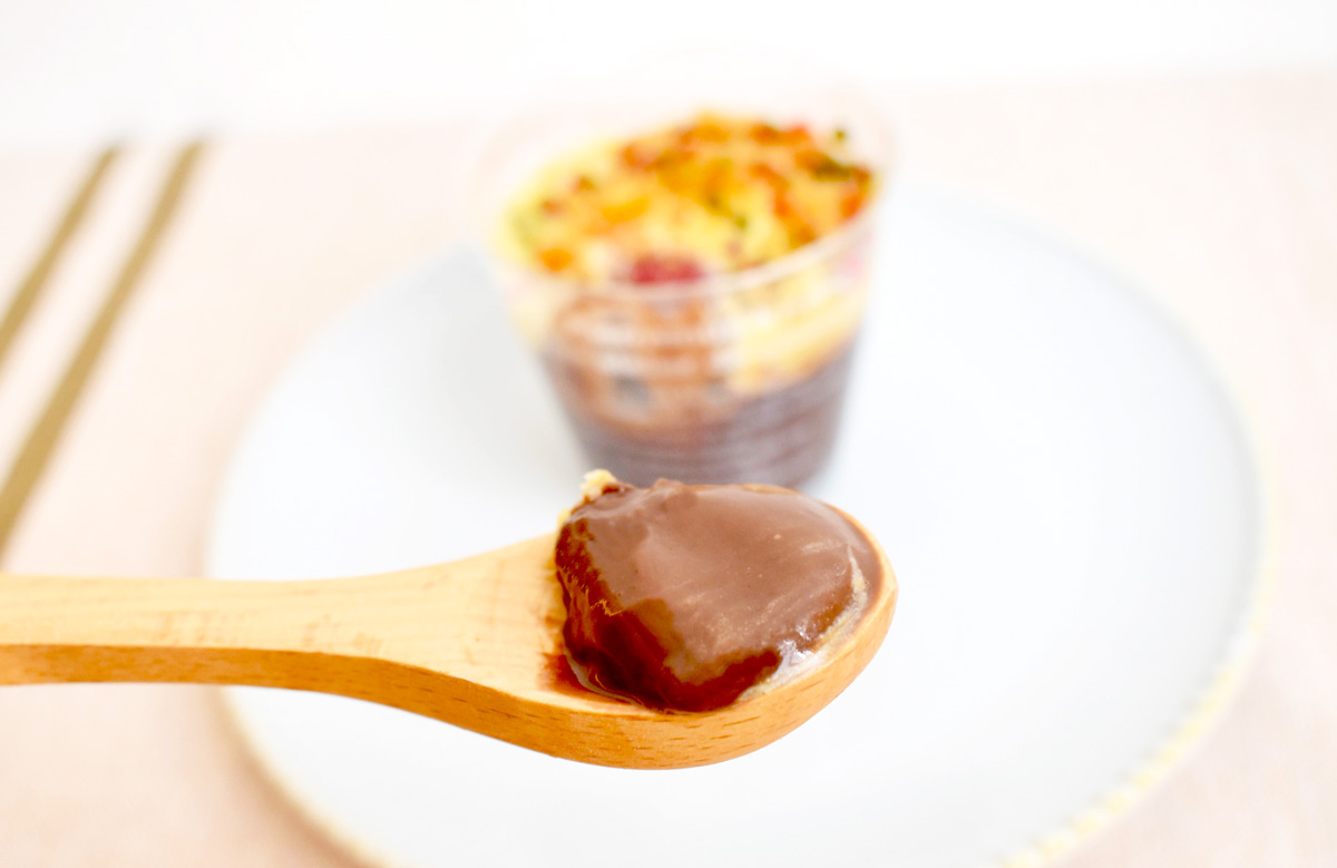下の層のチョコレートプリンはというと……ツヤツヤしていて、口に入れると、とろ~りなめらかな舌ざわり。甘すぎずビターな味わいで、こってりしているけれど、くどさはなく、ピスタチオクリームと一緒に食べてもおいしいっ! 寒さが増してくる今の季節にぴったりの、濃厚なチョコレートフレーバーです。