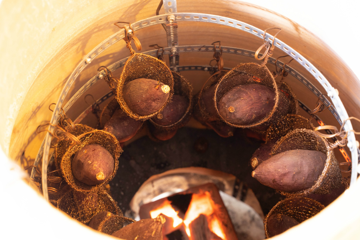 さつまいも1本がちょうど入る銅製のカゴにひとつずつ入れて並べ、さらに数時間かけて焼くとあって大量生産ができません。だからこそ、1本1本のおいしさは格別。水分がほどよく抜けて甘味がぎゅっと濃縮し、スイーツのような味わいを叶えました。