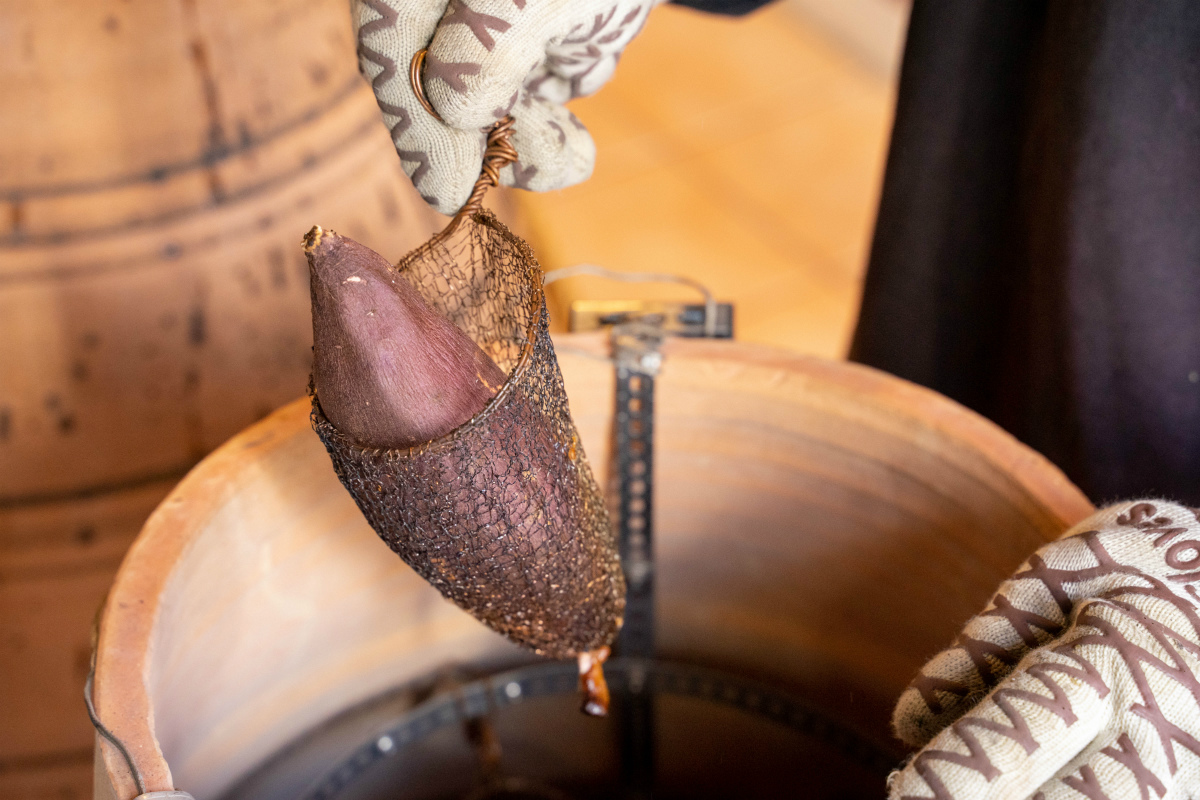 さつまいもは、短時間で一気に加熱するよりも時間をかけて中まで柔らかく焼き上げることでデンプンが糖化して甘くなります。この性質を利用し、同店では炭火を火種にして弱い火力でじっくり3~5時間焼き続け甘味を引き出します。遠赤外線効果で壺全体がじっくりと温まり、蜜のしたたるおいしい焼き芋へと仕上がるのだとか。