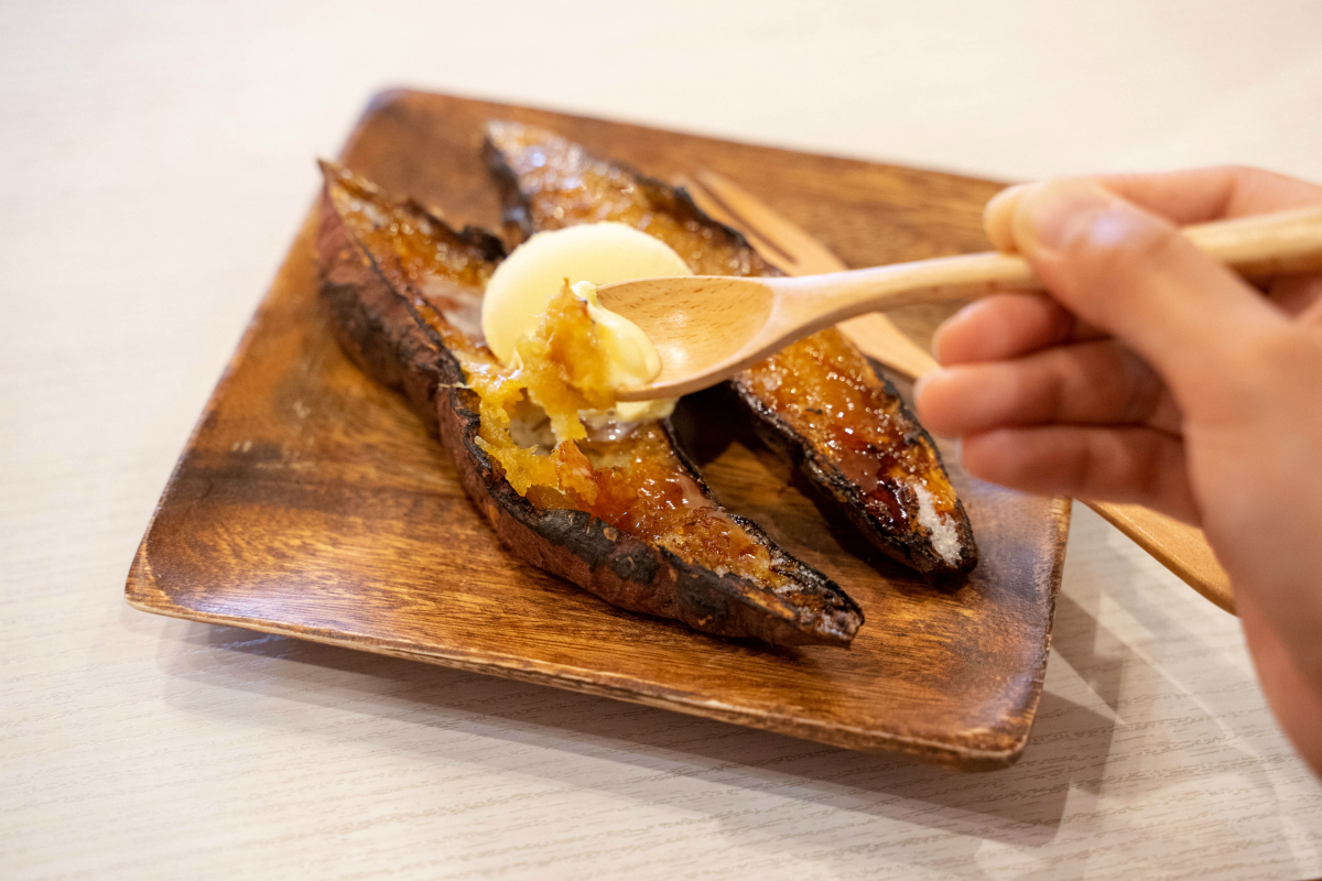 まずはこちらの「おいもブリュレ(850円)」。焼き芋の断面にグラニュー糖を振りかけてキャラメリゼしたスイーツで、トッピングのバニラアイスとの“ひやあつ”のコントラストが楽しめます。