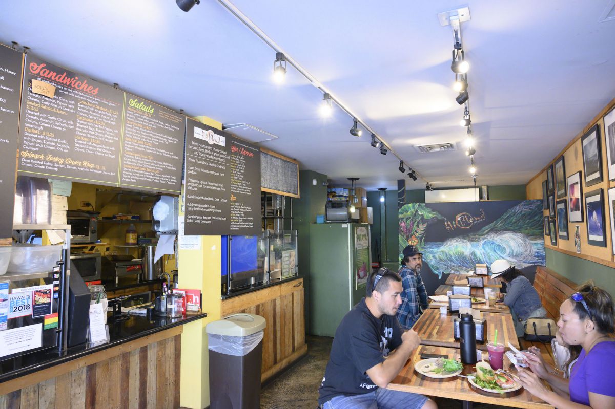 「ハイブレンド・ヘルスバー&カフェ」は、ハワイ産で農薬不使用のフルーツや野菜にこだわる、ヘルスコンシャスなロコからの支持があついカフェ。遺伝子組み換えや冷凍のものは一切使わないこだわりぶりです。