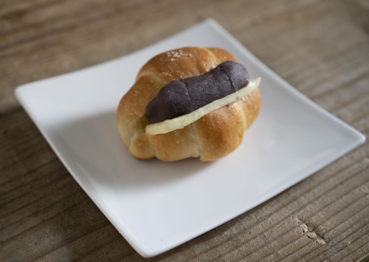 宮島らしいパンがこちら。宮島にある明治創業のもみじ饅頭店・博多屋のもみじ饅頭のこし餡を使用し、無塩バターと一緒に塩パンにサンドした「塩あんバター」です。カリッとした食感の塩パン生地に、程よい甘さのこし餡とバターの味が合わさって、噛めば噛むほど美味しさが増します。パンにかかる粗塩もいいアクセントになっていますよ。
