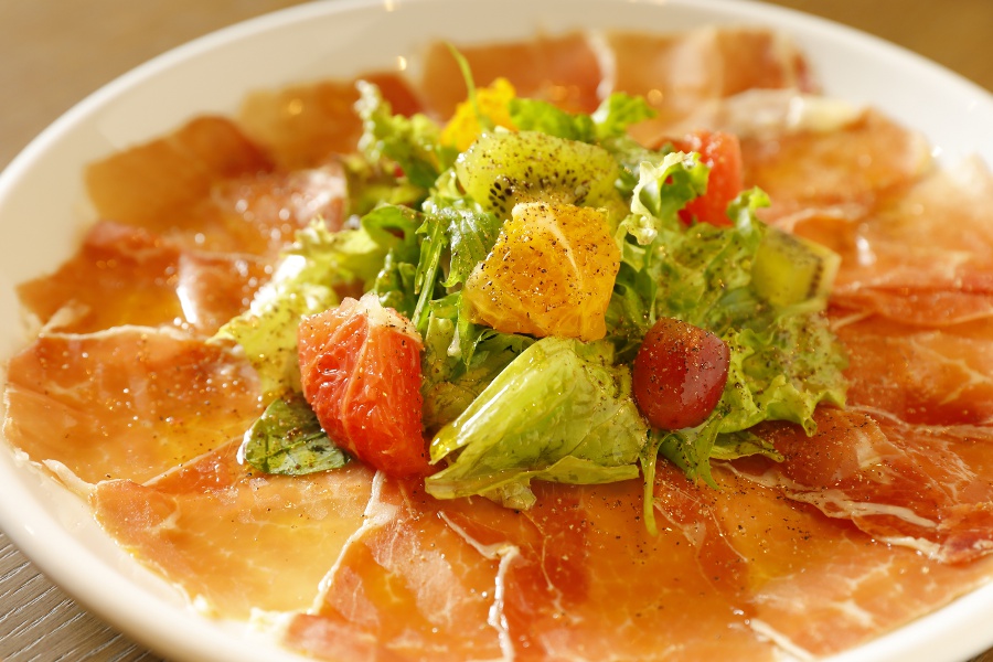 お酒に合うスナックのおすすめは、パルマ産の生ハムを原木で仕入れ店内でスライスした生ハムプレート(写真は2~3人前分1848円)。噛めば噛む程に深まる味わいがたまりません!ワインはもちろんビールとの相性も抜群です。ぜひお酒のお供に注文してみてくださいね。朝7時から夜11時まで営業しているため、使い勝手も便利なBLUE BOOKS cafe 京都。どの時間帯に訪れても寛ぎの時間を提供してくれるのが、最大の魅力です。
