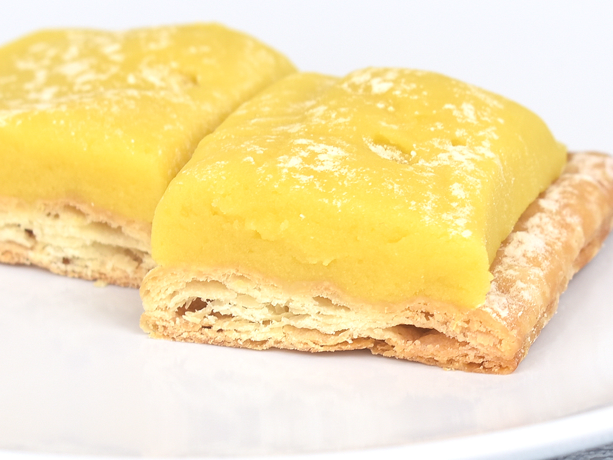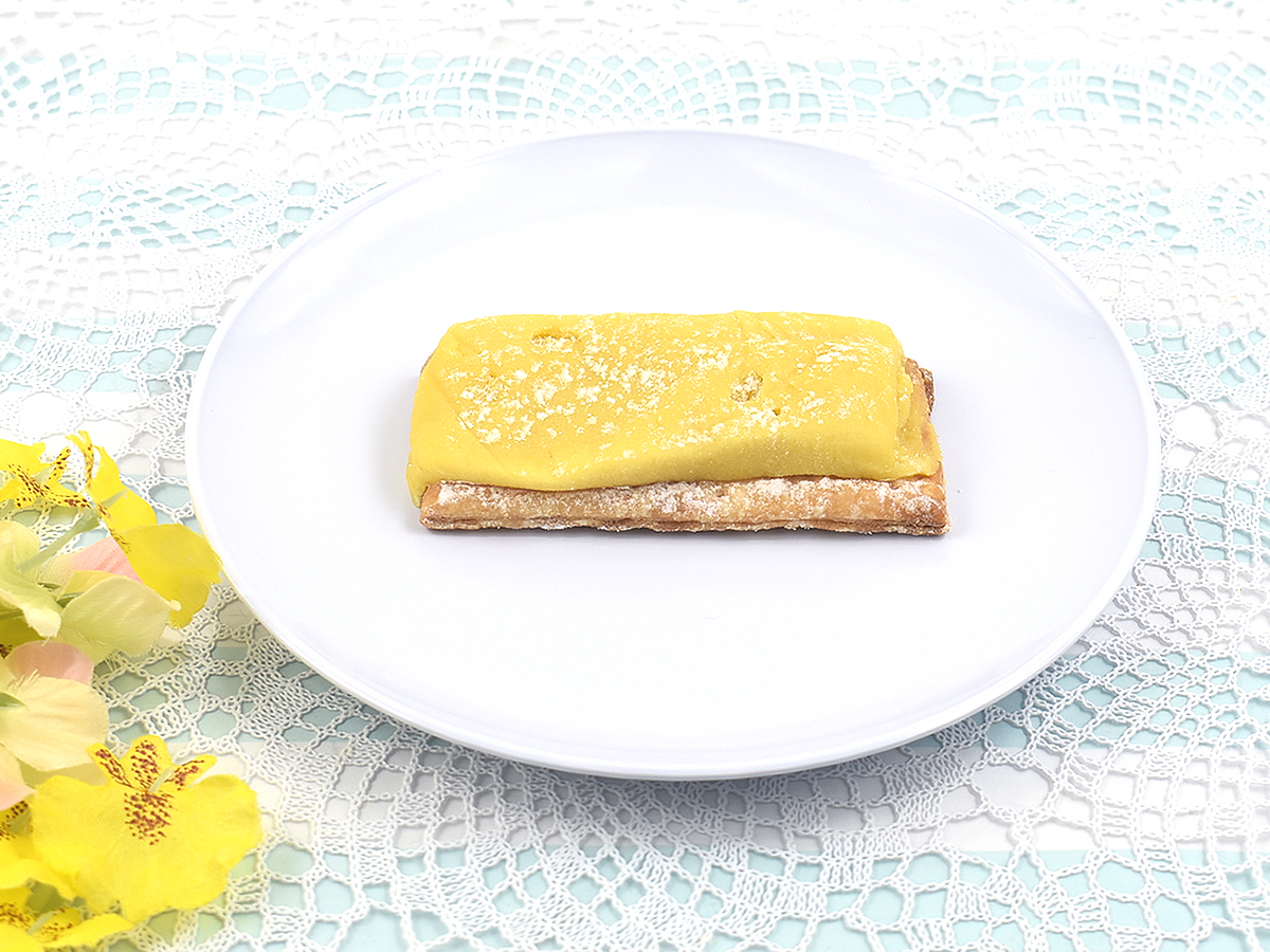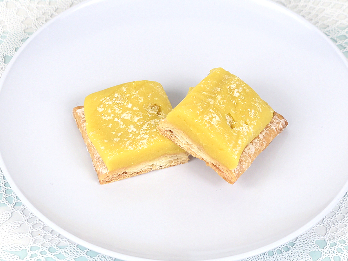 長方形のパイ生地の上に、スイートポテトクリームをたっぷりのせた「スイートポテトパイ」。やや小ぶりのサイズとはいえ、クリームの厚みが存在感を出し、雪化粧のように粉砂糖がまぶされ、鮮やかな色合いに思わず目を奪われてしまいます。