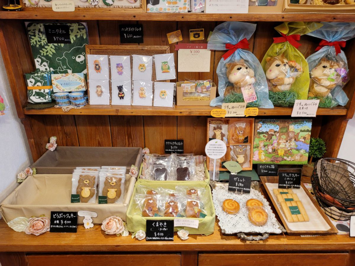 オリジナル雑貨やぬいぐるみ、お店の看板商品の「どうぶつクッキー」や「くまやき」などの焼き菓子も販売しています。