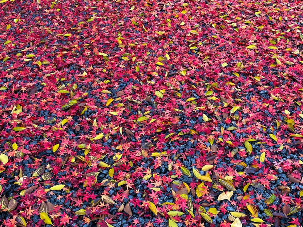 境内に入ると、美しい紅葉が迎えてくれました。12月上旬でも、きれいな紅葉が残っているものですね。あちこちの木の下に、色とりどりの散紅葉も広がっていました。