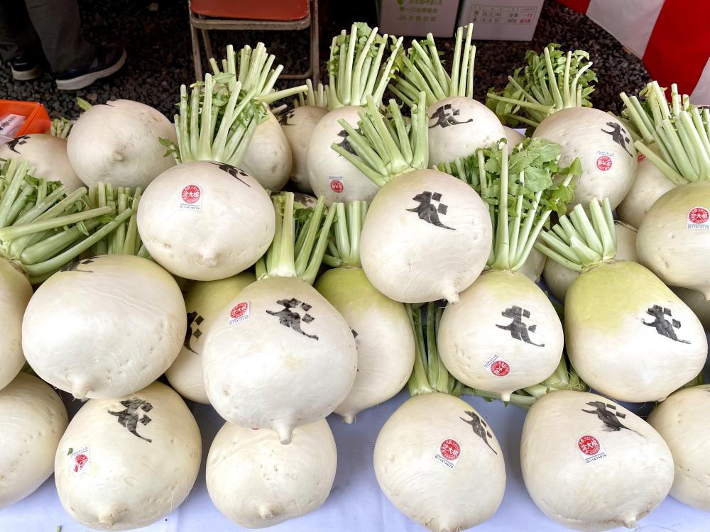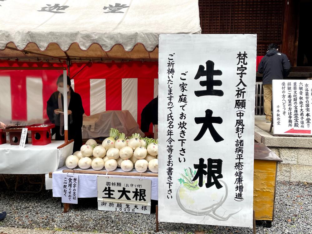 立派な大根がずらり。ここに並ぶ大根はすべて祈祷されたもので、一つ一つにお釈迦様を意味する梵字が書写されています。授与される大根は「聖護院大根」という京野菜のひとつで、丸い形が特徴です。水分が多くてやわらかいので、煮ものには最適だそう。せっかくなので一ついただきました(お守り付で1000円)が、ずっしり重くてびっくりしました。ちなみに、大根炊きで振る舞われる大根の煮物には、一般的な細長い大根が使われるそうです。