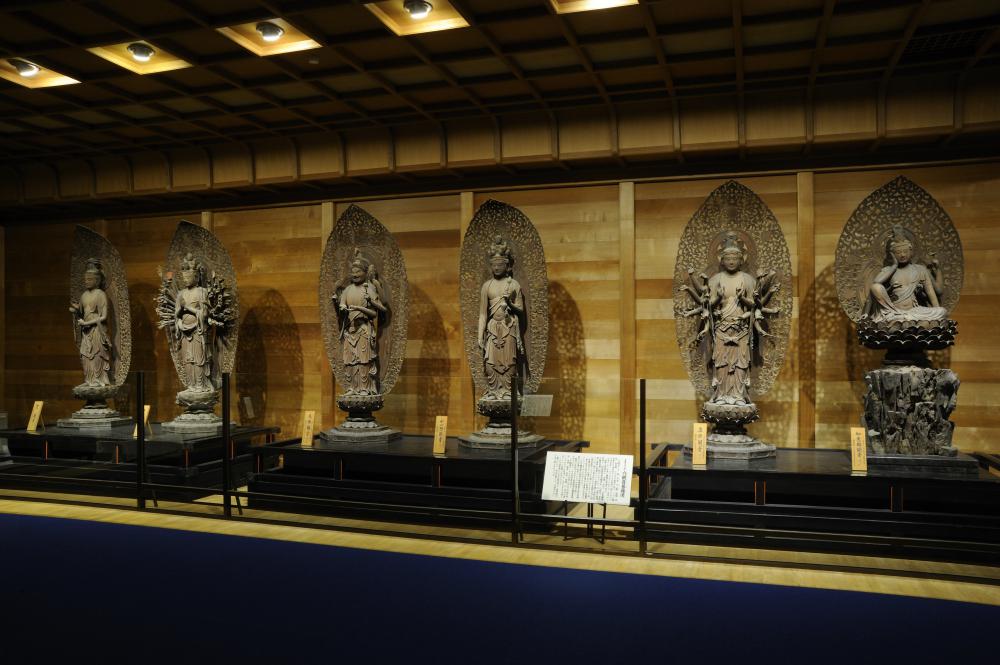 そして3つ目は、霊宝殿に安置される六観音菩薩像です。こちらの霊宝殿には、快慶をはじめ、名仏師が手がけた貴重な仏像彫刻が多数おさめられています。そのなかの六観音菩薩像は、運慶の弟子である定慶の作で、六道信仰に基づいて作られた六体の観音様。聖、千手、馬頭、十一面、准胝、如意輪の六体で構成され、この六体が揃って安置されているのはなんと全国で唯一! 6体並ぶとやはり迫力があります。