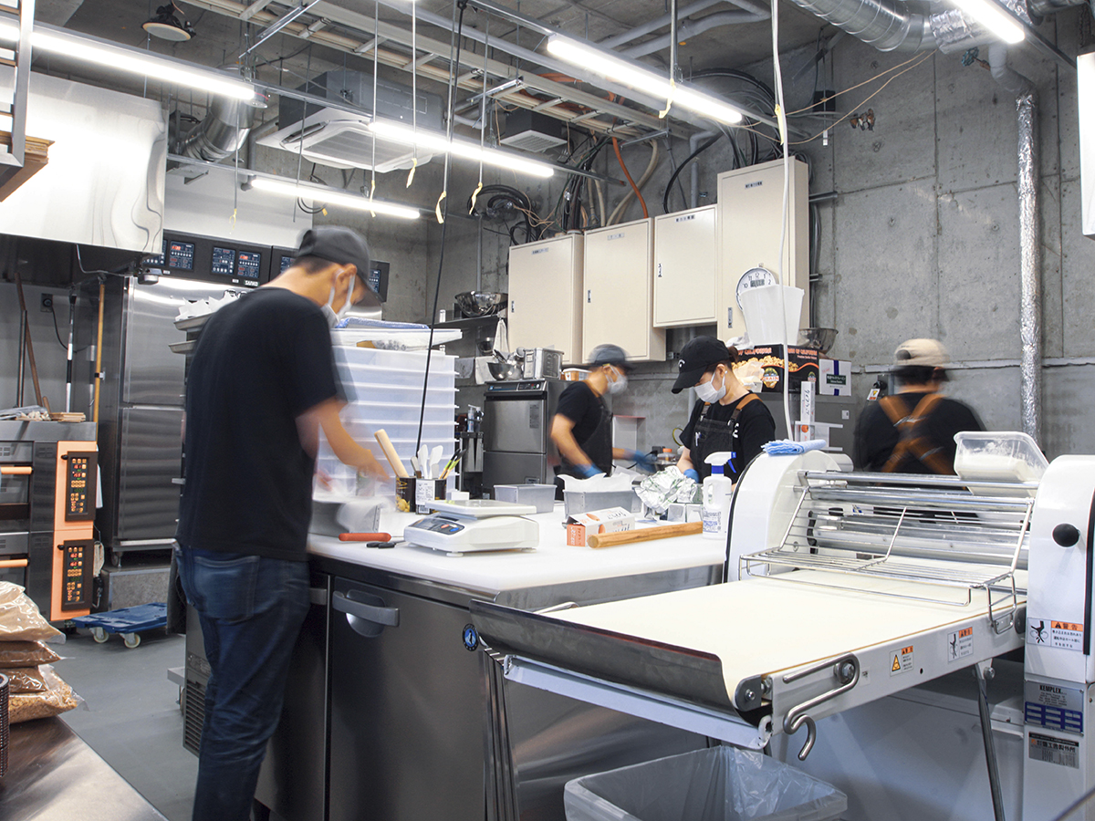 パン職人が熱心にパンを作っている様子が見えます。インダストリアルカフェというコンセプトは、作っている姿を見て楽しんでほしいという思いから生まれました。