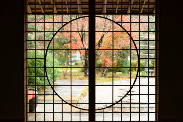 広間の障子の木枠は、昇っていく月をダイナミックに表現。こちらの障子は、下半分を持ち上げて外の景色を楽しむことができる、雪見障子になっていました。