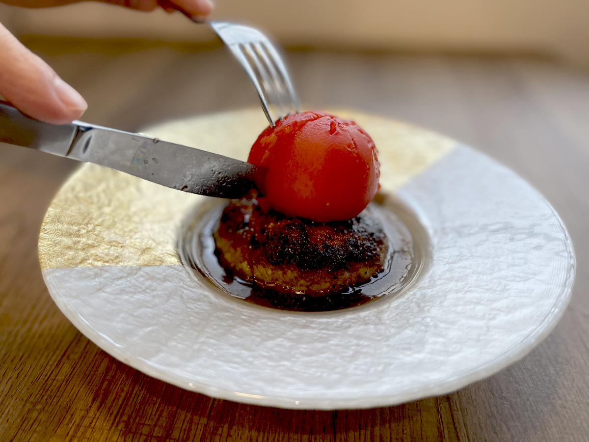 主役のハンバーグは、パン粉を表面にまぶして二度焼きすることで、肉汁を閉じ込めているのだそう。トマトとともに味わえば、ジューシーさがいっそう引き立つ〜!