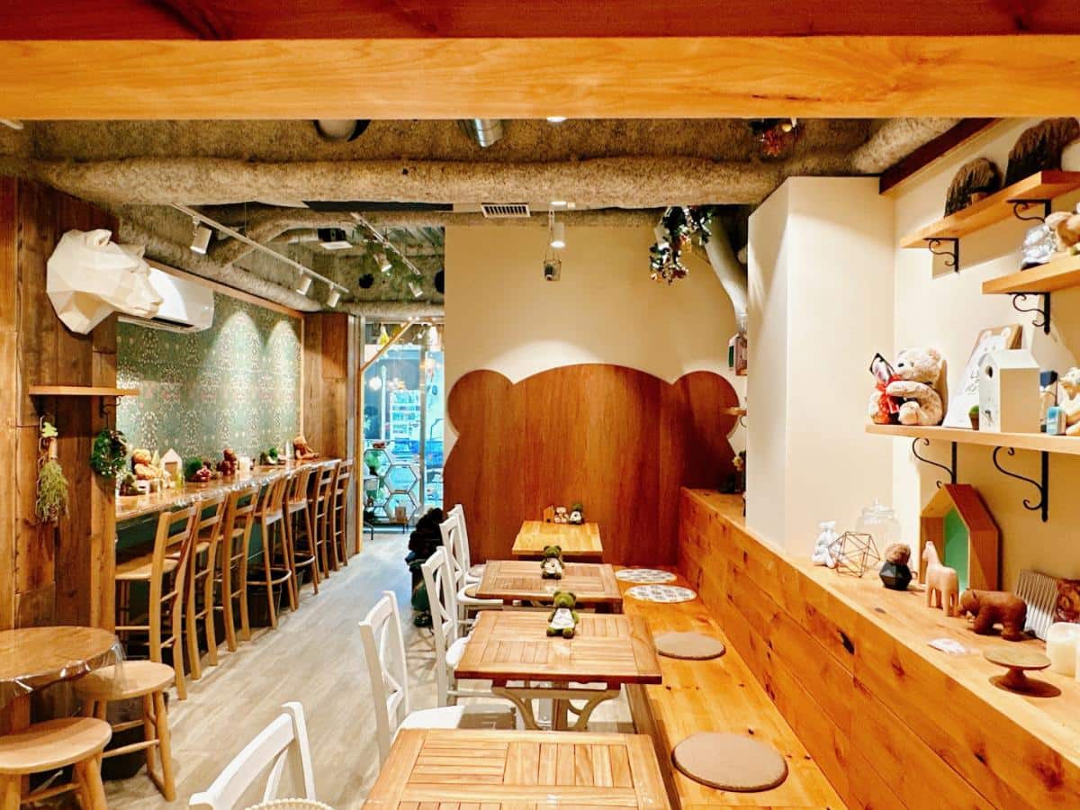 北欧の森にすむクマのカフェ”がテーマの「はちくまカフェ」。ウッディな店内で、女性だけでなく男性にも人気。あちこちにクマがいるほっこり癒やし空間です。