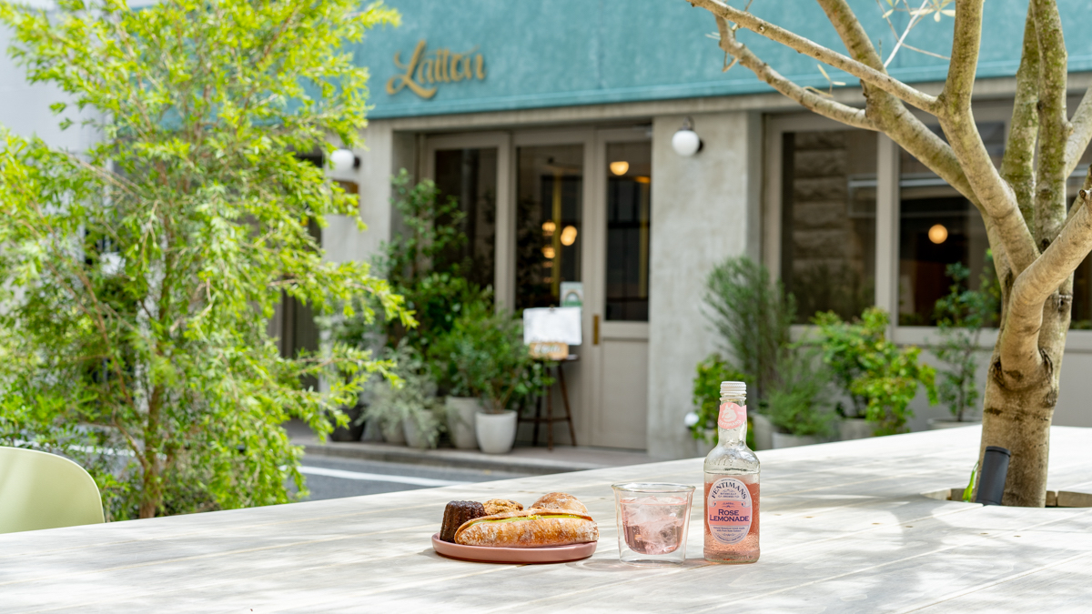 暖かな木漏れ日に包まれながら、ひと息つくことができるテラス席。ここはデザインホテル「ホテルヒソカ(hotel hisoca)」のエントランス前です。宿泊していなくてもフロントでドリンクをオーダーするだけで、シンボルツリーと調和した大型の木製テーブルや4人がけのガーデンテーブルで「Brasserie Laiton」のパンを楽しむことができます。