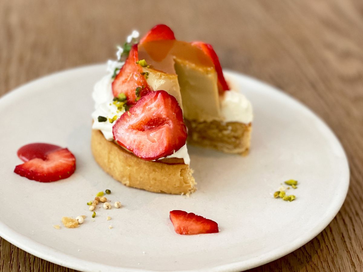 そんなプリンと、外側はサクサク・内側はねっとりとした食感のタルトや、フレッシュで甘みがしっかりとしたイチゴ、甘さ控えめなクリームが口の中で融合して、自然と笑顔がこぼれてしまうような幸せな味わいです。