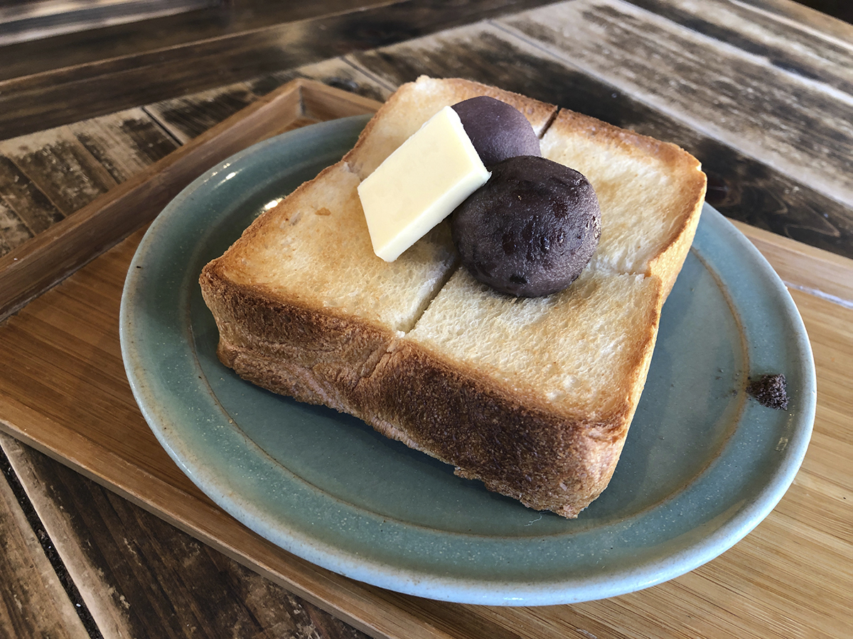 「しゅまりあんバタートースト」(680円)はこしあんか粒あんかを選べるのですが、両方食べたい人のためにダブルあんこの「よくばりしゅまりあんバタートースト」(880円)も用意されているとのことで、今回は迷わず「よくばり」をチョイス。