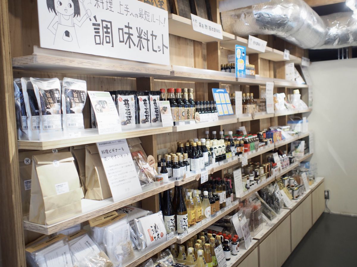 さまざまな調味料が揃う棚は圧巻!ここにあるものがすべて発酵食品であることを思い出し、あらためて驚きます。思わず目移りしてしまう、見ているだけでも楽しいラインナップです。