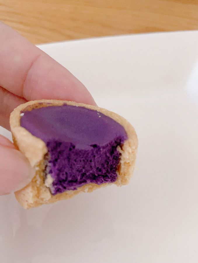 ひと口サイズなのでさっと食べられるのもうれしいですね。このパープルの鮮やかな色合いが目をひくのでおみやげにも喜ばれそう!