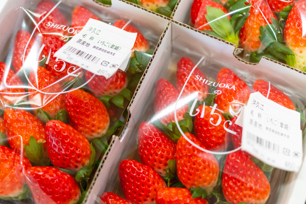 なかでも人気があるのはいちご。御前崎市はいちご栽培でも有名で、品種は章姫(あきひめ)や紅ほっぺなど。朝摘みの完熟いちごは、甘酸っぱくておいしい!産直なのでお値段も良心的です。