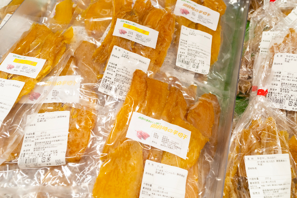 ちょっと珍しいのが、干し芋コーナー。農産物売り場の一角に、スライス状や、スティック状の干し芋が並んでいます。収穫したサツマイモを蒸して皮をむき、天日で乾かした干し芋は、柔らかくて、噛めば噛むほど味わい深い。自然の優しい甘さです。