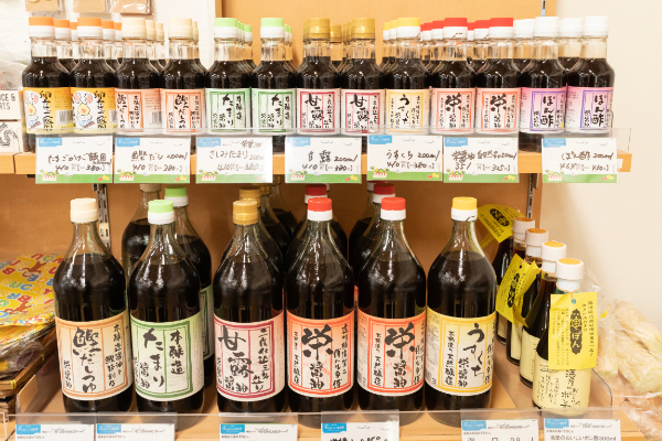 御前崎市の隣り、掛川市の横須賀エリアで造られている「栄醤油」が全種類そろっていました。江戸時代創業の老舗「栄醬油醸造」の商品で、国産丸大豆を原料に木桶で仕込む、昔ながらの天然醸造。ミニサイズはおみやげにぴったりです。