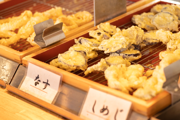 カウンターには、地場野菜や新鮮な魚介の天ぷらが10種類ほど並んでいます。これらの天ぷらを好きなだけのせてオリジナル天丼が作れるという人気メニューが「天ぷらのせ放題天丼(味噌汁・漬け物付、880円)」。カツオの香りが豊かな自家製のかけつゆでいただきます。