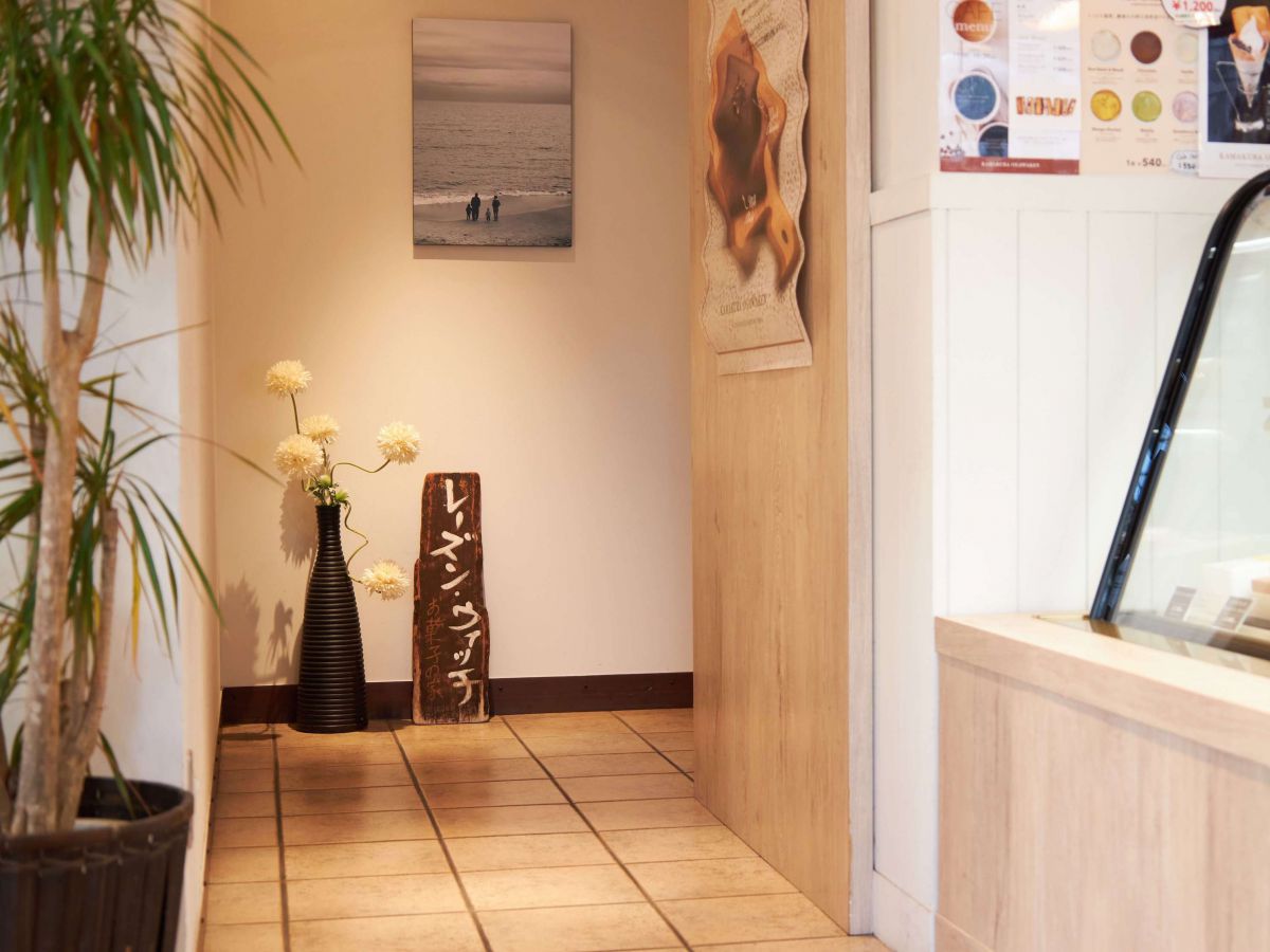 店内正面の大きなショーケースにはレーズンウィッチだけでなく、ショートケーキ・スフレチーズケーキ・プリンなどのプチガトーが。ショップゾーンには、そのほかにも日持ちのする焼き菓子や2021年8月に新登場した「カップアイスクリーム」などもあります。