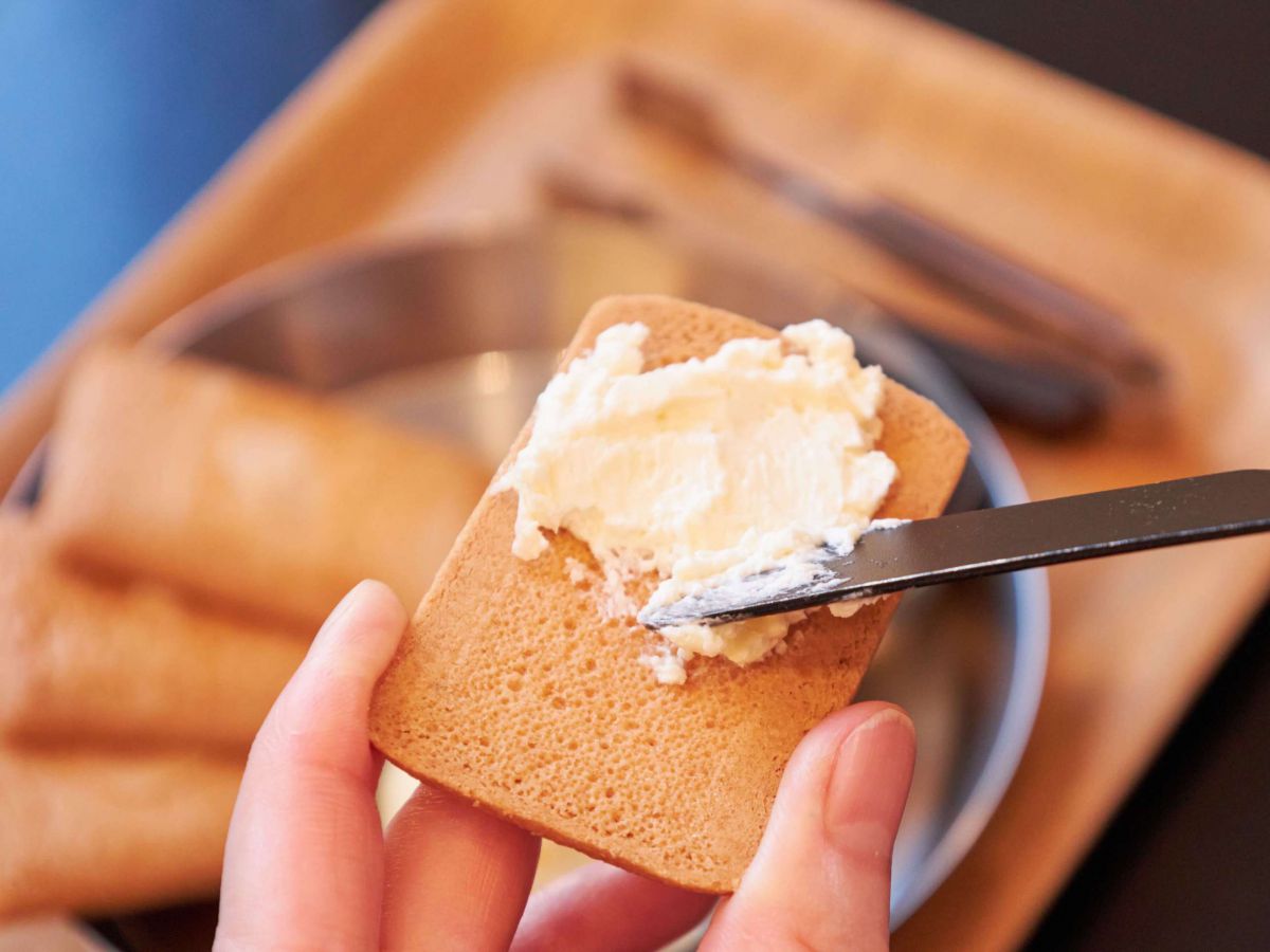 まずはサクサクのバターサブレの裏にバタークリームを均一に塗ります。簡単そうに見えて、これが意外と難しい!