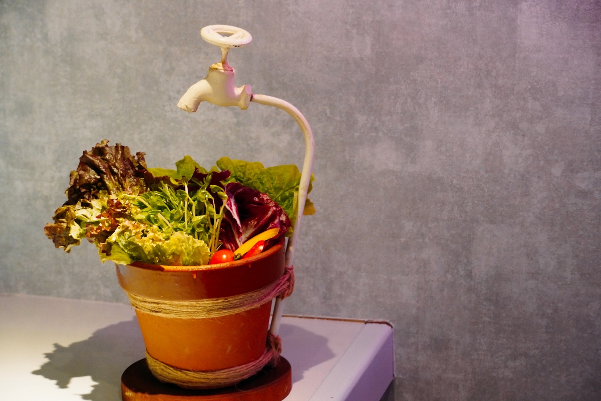 サムギョプサルを注文するとセットで野菜(サムギョプサルの料金に+550円)が付きます。植木鉢に入ったキュートなビジュアルで登場。たっぷりの野菜でお肉を巻いて食べましょう!