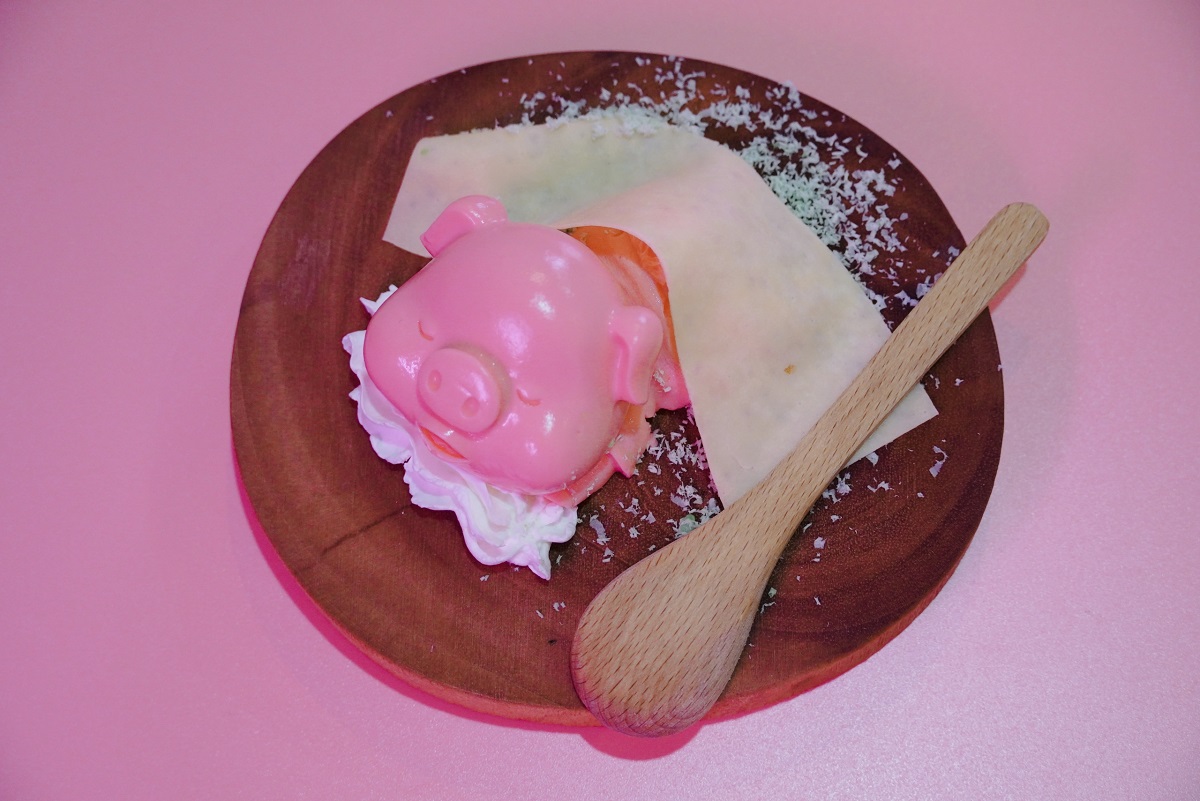 一番人気のスイーツは「パンナコブタ」(748円)。クレープ生地の布団をかけたピンクのブタがぐっすり眠っています! ほんのり甘くてプルプルの食感。どこからスプーンを入れるか、悩んでしまいますね。