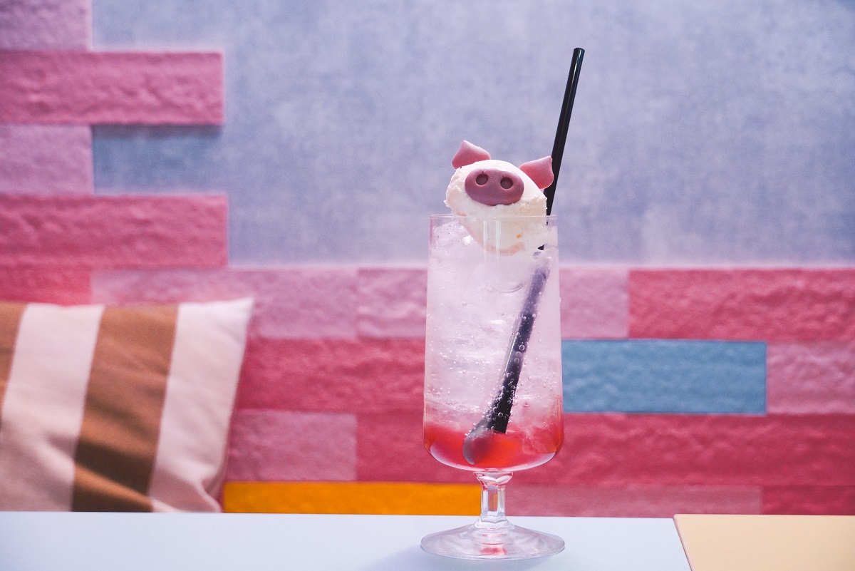 トッピングのブタさんのアイスが愛らしい「クリームサワー」(638円)。耳と鼻はチョコレートです。「イチゴクリームサワー」(写真)のほか、メロン、ブルーハワイ、コーラがあります。