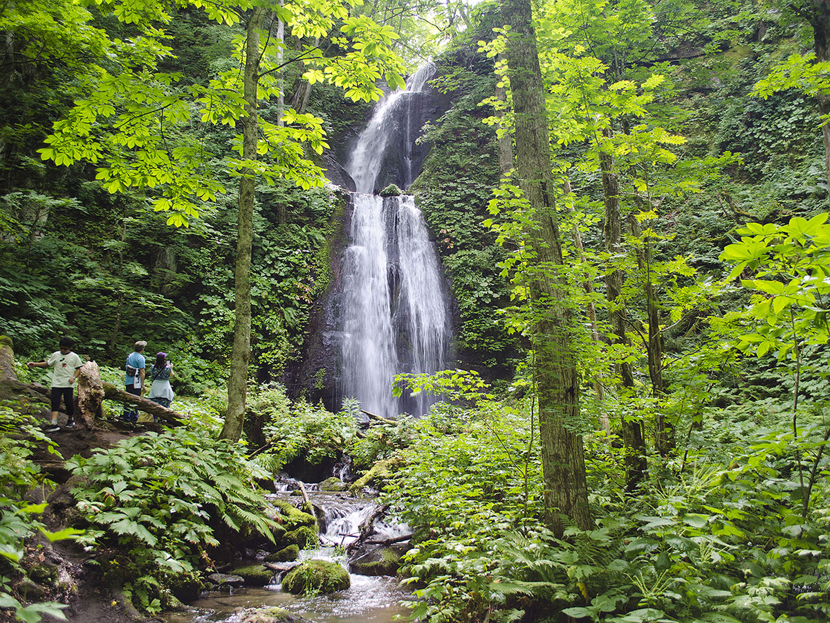 細く白い糸を束ねたような白糸の滝は、落差が30mほど。木々の間から見え隠れする姿は神秘的!