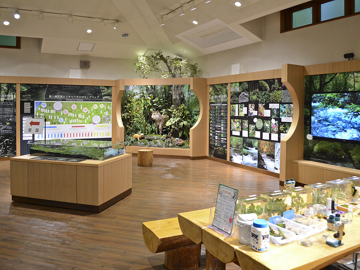 奥入瀬渓流の自然をもっと深く知りたいなら、奥入瀬渓流館の自然情報展示コーナーをチェック!奥入瀬渓流の成り立ちや生態系をパネルや写真、デジタルサイネージでわかりやすく紹介しています。ひときわ目を引くのは中央に置かれた本物そっくりのジオラマです。奥入瀬渓流の見どころが丸わかり♪歩いているだけでは見えない奥入瀬渓流の複雑な地形を、鳥になった気分でじっくり観察できます。