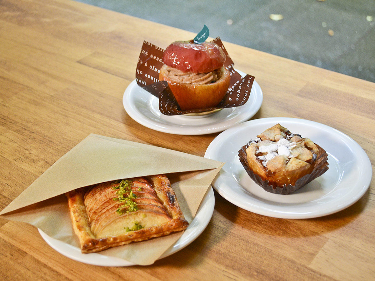 青森りんごを使用したクランブル(右:410円)やパイ(左:410円)、りんごを丸ごと使用した「あおもりんごさん」(奥:648円)などSNS映えもばっちりです。