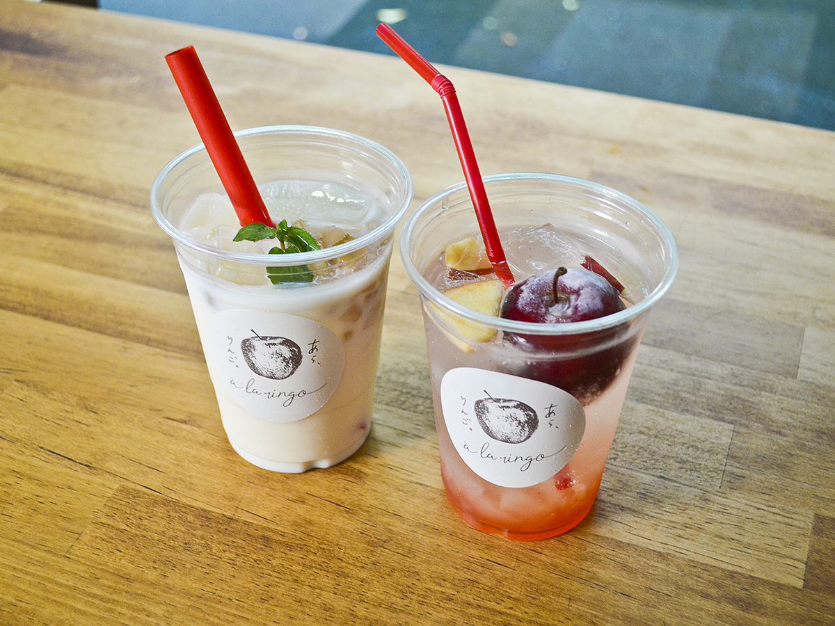 奥入瀬のむヨーグルトを使用したりんごヨーグルト(左:432円)は奥入瀬店限定!りんごサイダー(右:432円)は自家製シロップとゼリーで満足感アップ。