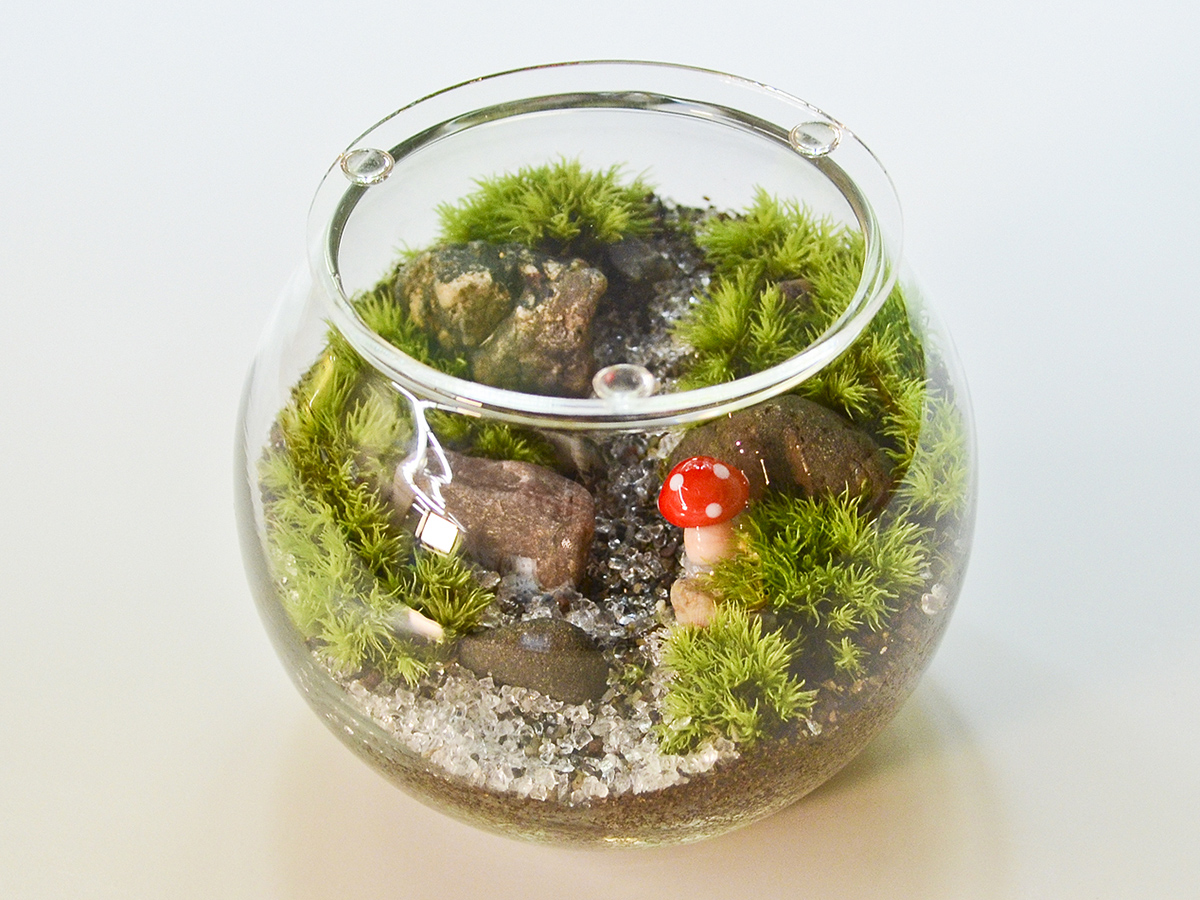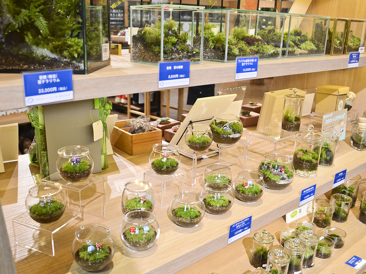 ガラスの器の中に奥入瀬のコケの森が再現された苔テラリウム(3520円〜)。お手入れも簡単なのでギフトにもぴったりです。