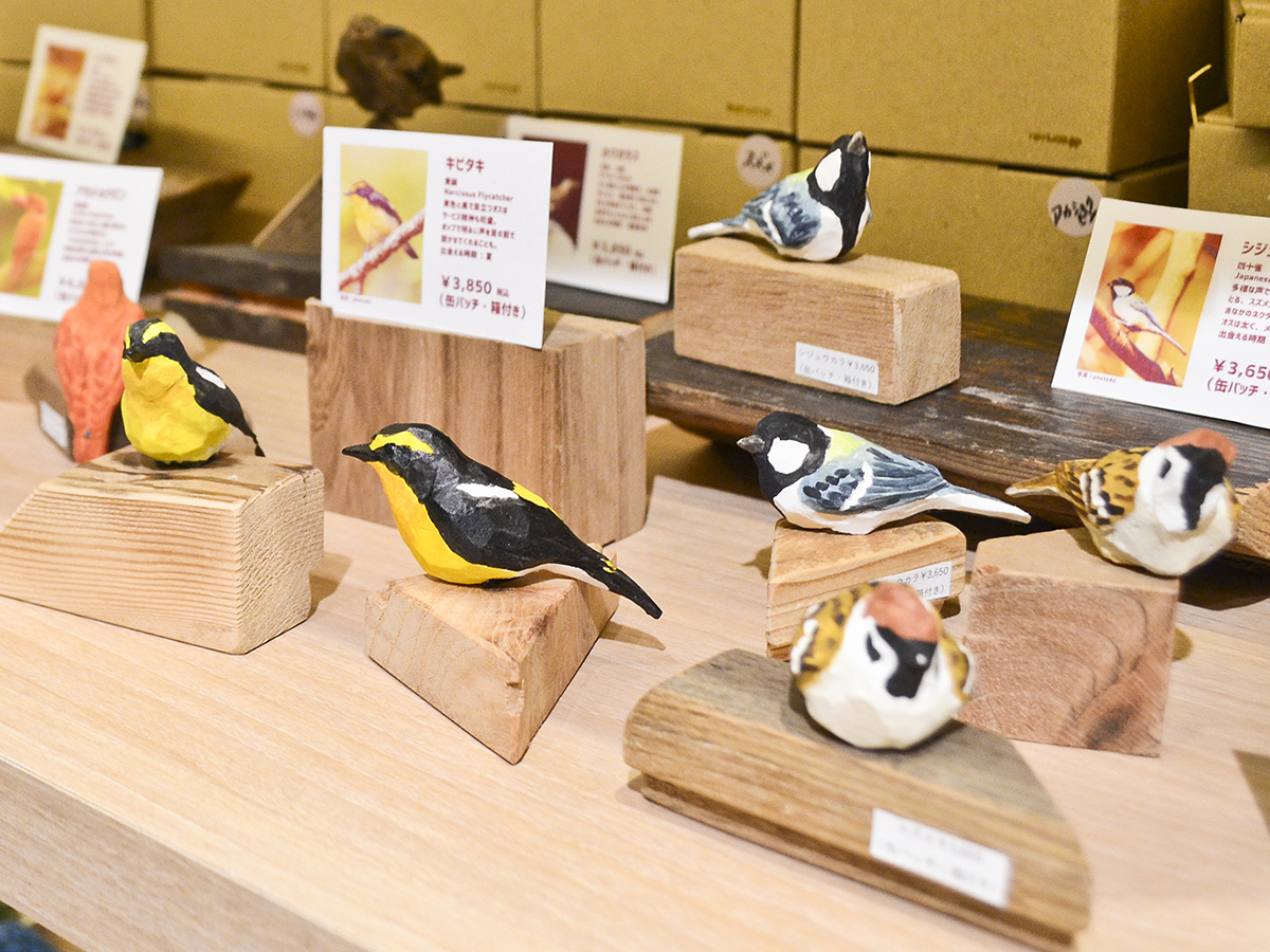 奥入瀬にすむ小鳥をモチーフにした本物そっくりの置物。バードカービングは木ならではの温もりや安らぎを与えてくれます。写真は「肩チュンbirdシリーズ」3650円〜(缶バッジと箱付き)。